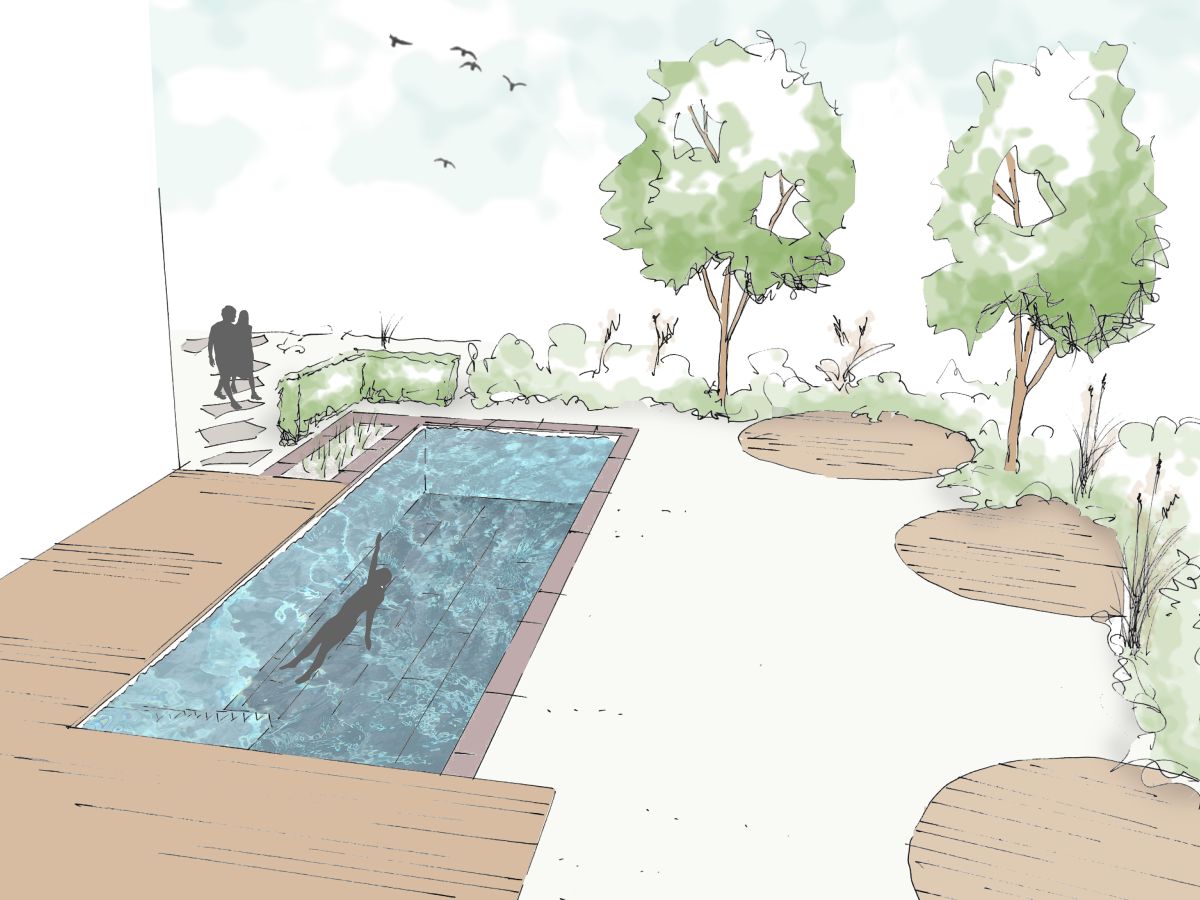 Naturpool. Ein Becken. Lang genug, um ein paar Bahnen zu ziehen. Weiches Wasser. Kein Chlor. Mikroorganismen, die für unsere Sauberkeit arbeiten. Klarer Blick zum Boden. Keine Schlingpflanzen an den Füßen, dafür ganz viel Natur drum herum und Weitblick auf Weide und Wald. Ruheinseln mit Liegen. Ein Platz am Hof, um sich treiben zu lassen. Im Wasser und in deinen Gedanken.